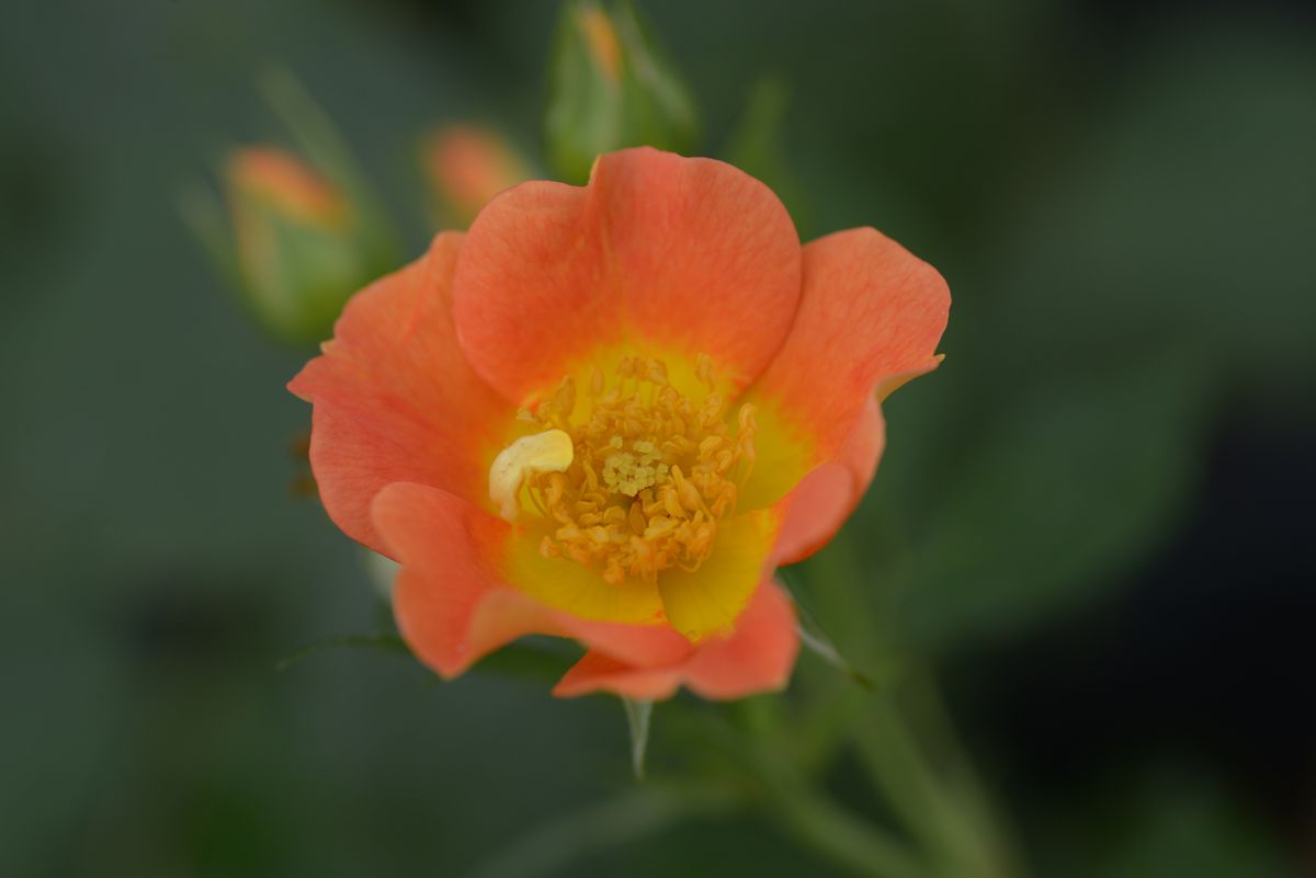 Leicht duftende, nur locker gefüllte Blüten in Orange, in der Mitte und auf der Rückseite gelb, die im Abblühen zu Creme und Rosa verblassen. Dadurch ergibt sich über die gesamte, lange Blütezeit ein farbenfrohes Bild.